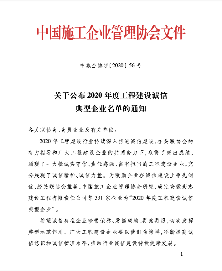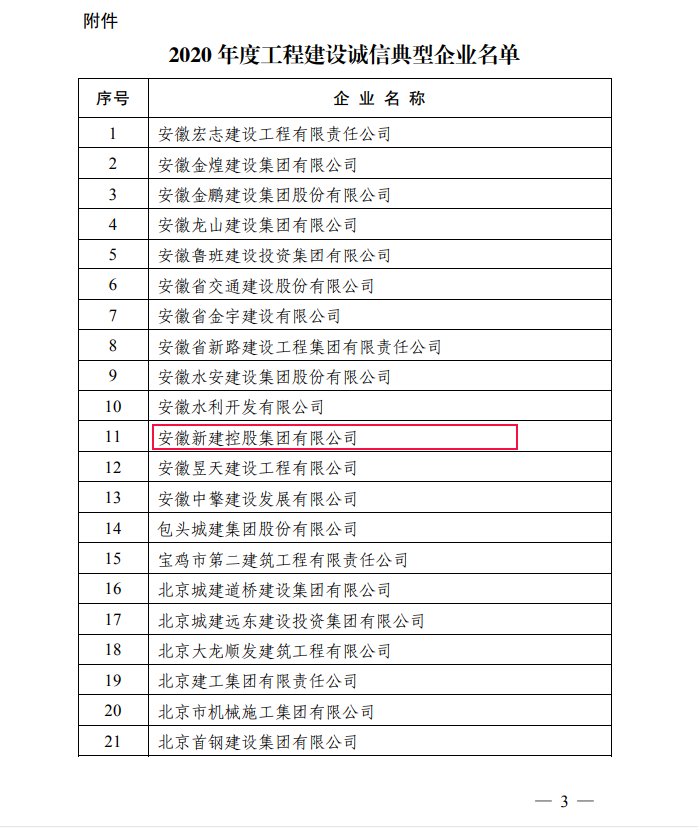 近日,經(jīng)中國(guó)施工企業(yè)管理協(xié)會(huì)綜合評(píng)審,安徽新建控股集團(tuán)有限公司既2019年獲得工程建設(shè)誠(chéng)信典型企業(yè)稱號(hào)后,又一次獲得全國(guó)“2020年度工程建設(shè)誠(chéng)信典型企業(yè)”殊榮。