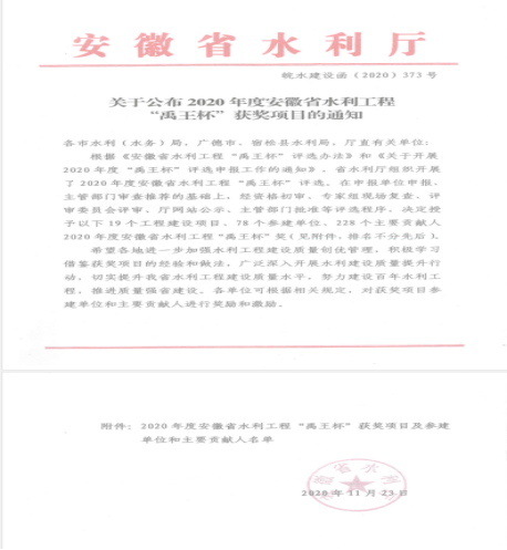 近日,根據(jù)《安徽省水利工程“禹王杯”評選辦法》和《關(guān)于開展2020年度“禹王杯”評選申報工作的通知》,在省水利廳組織開展的評選活動中,經(jīng)資格初審、專家組現(xiàn)場復查、評審委員會評審、公示,主管部門批準等程序,由安徽新建控股集團有限公司施工的“黃山風景區(qū)麻川河丹井口至洗藥橋段防洪治理工程施工2標”工程脫穎而出,被安徽省水利廳綜合評定為“2020年度安徽省水利工程‘禹王杯’獎”!