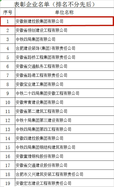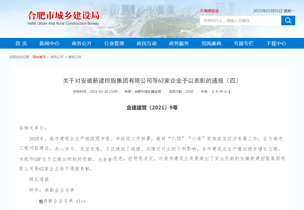 2月26日,合肥市城鄉(xiāng)建設(shè)局印發(fā)《關(guān)于對安徽新建控股集團(tuán)有限公司等62家企業(yè)予以表彰的通報(bào)(四)》(合建建管[2021]9號)紅頭文件,對安徽新建控股集團(tuán)有限公司等62家企業(yè)在2020年面對疫情、汛期的不利影響,全力推進(jìn)工程項(xiàng)目建設(shè),為我市GDP過萬億做出的積極貢獻(xiàn)進(jìn)行通報(bào)表彰,安徽新建控股集團(tuán)有限公司在該批次表彰中名列榜首。