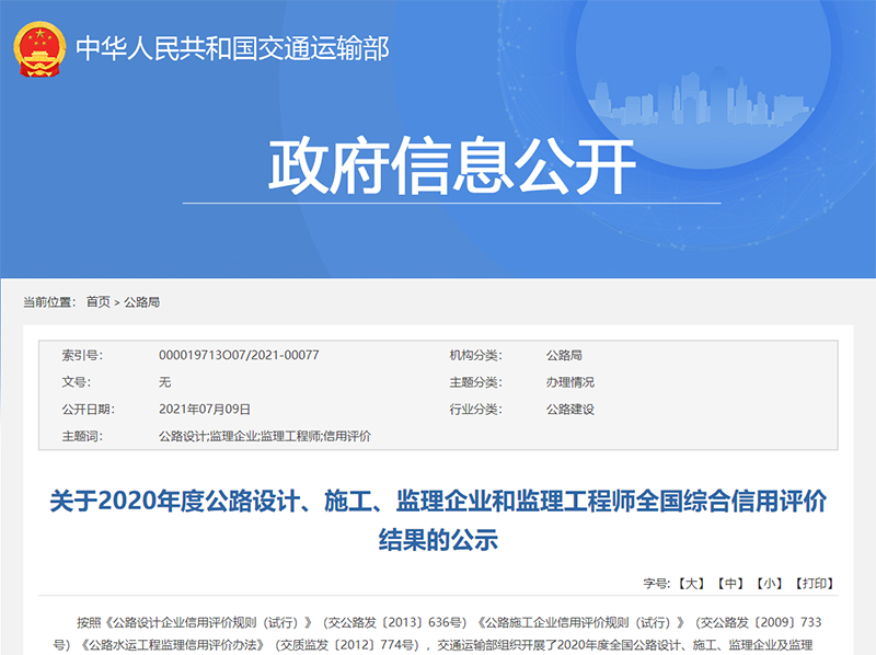 近日,交通運(yùn)輸部發(fā)布了《2020年度公路設(shè)計(jì)、施工、監(jiān)理企業(yè)和監(jiān)理工程師全國綜合信用評價(jià)結(jié)果的公示》,安徽新建控股集團(tuán)既2019年度后再次榮獲公路施工企業(yè)信用評價(jià)最高等級——AA級。