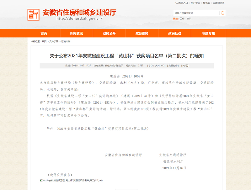 11月17日,安徽省住房和城鄉(xiāng)建設(shè)廳發(fā)布2021年安徽省建設(shè)工程"黃山杯"獲獎(jiǎng)項(xiàng)目名單。安徽新建控股集團(tuán)承建的合肥高新區(qū)復(fù)興路(創(chuàng)新大道——石蓮南路)、菖蒲路(長(zhǎng)寧大道——三星東支路)、三星東支路(菖蒲路——銘傳路)道排及附屬工程項(xiàng)目榜上有名。