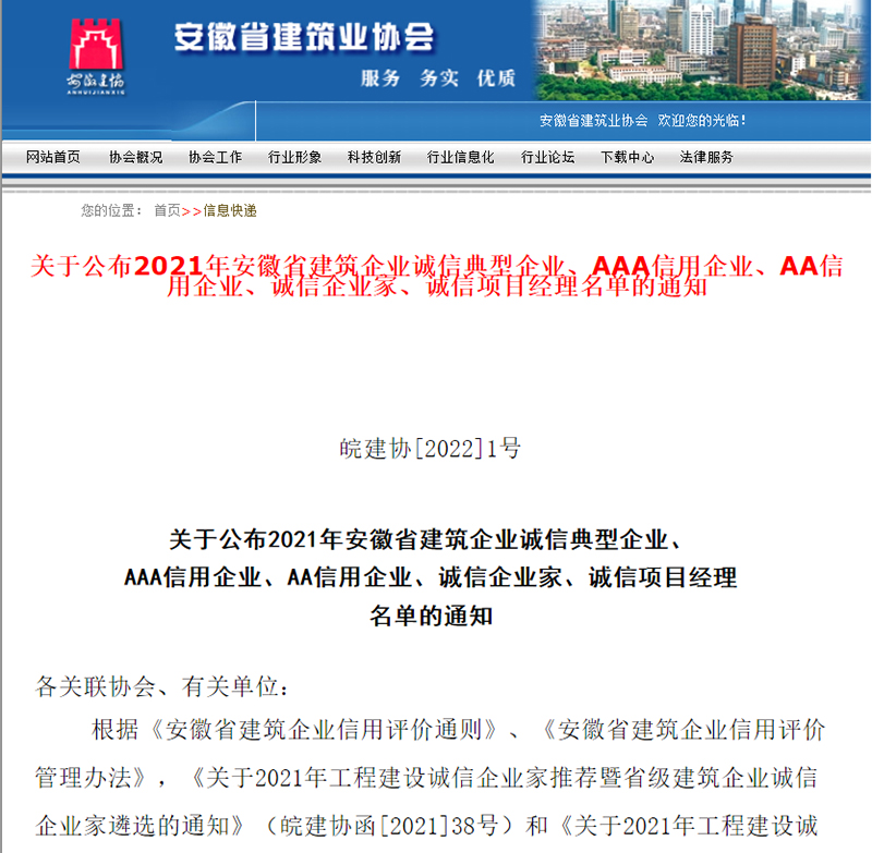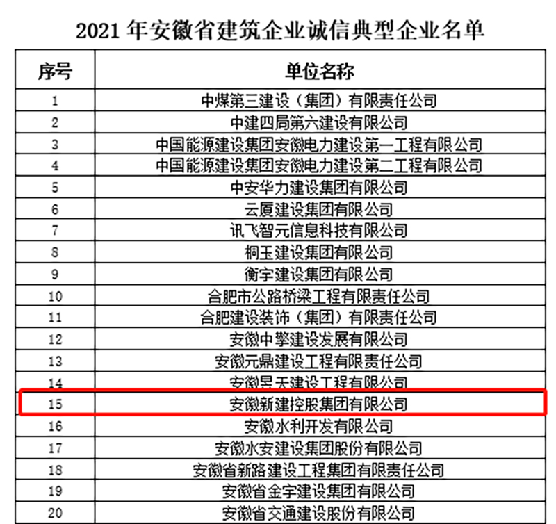 1月5日,安徽省建筑業(yè)協(xié)會分別公布了2021年安徽省建筑企業(yè)誠信典型企業(yè)、AAA信用企業(yè)評價結果,安徽新建控股集團憑借卓越的服務質量、品牌認知度和良好的社會信譽獲評“安徽省建筑企業(yè)誠信典型企業(yè)”和“AAA信用企業(yè)”兩項殊榮。