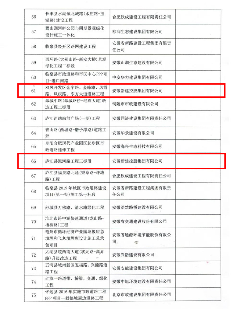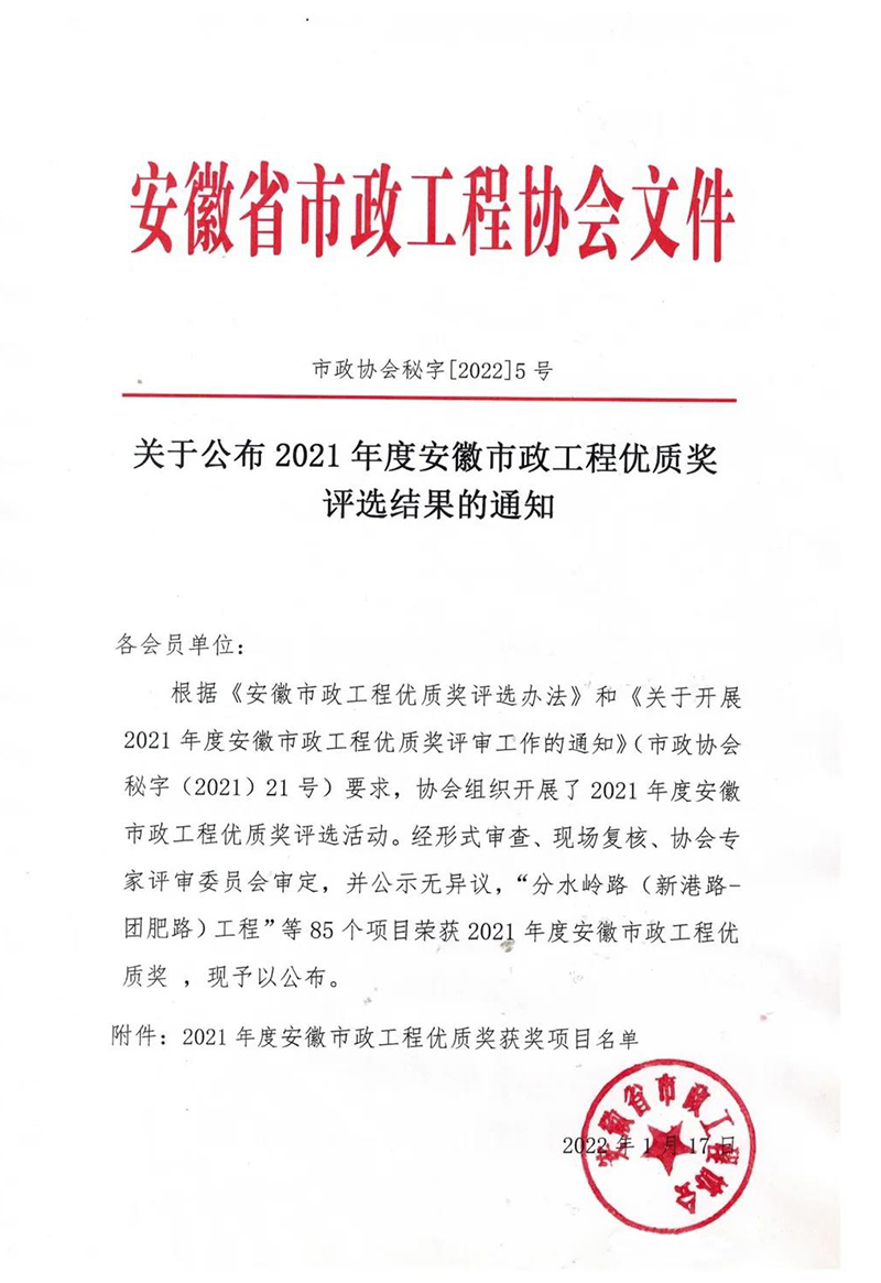 2022年1月17日,安徽省市政工程協(xié)會(huì)公布了2021年度安徽省市政工程優(yōu)質(zhì)獎(jiǎng)評(píng)選結(jié)果的通知,經(jīng)形式審查、現(xiàn)場(chǎng)復(fù)核、協(xié)會(huì)專家評(píng)審委員會(huì)審定,并公示無(wú)異議,安徽新建控股集團(tuán)有限公司承建的四項(xiàng)工程榮獲“2020年度安徽省市政工程優(yōu)質(zhì)獎(jiǎng)”!