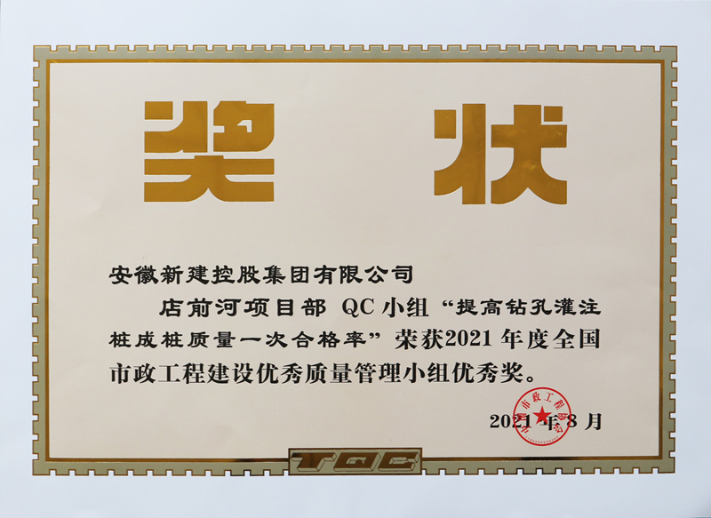 近日,中國(guó)市政工程協(xié)會(huì)頒發(fā)了2021年度全國(guó)市政工程建設(shè)優(yōu)秀質(zhì)量管理小組獲獎(jiǎng)證書,安徽新建控股集團(tuán)2項(xiàng)QC小組成果“深基坑開挖中鋼板樁防護(hù)施工”、“提高鉆孔灌注樁成樁質(zhì)量一次合格率”榮獲優(yōu)秀獎(jiǎng),工程質(zhì)量管理繼續(xù)向前邁步。
