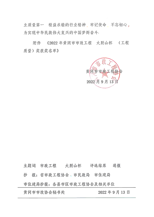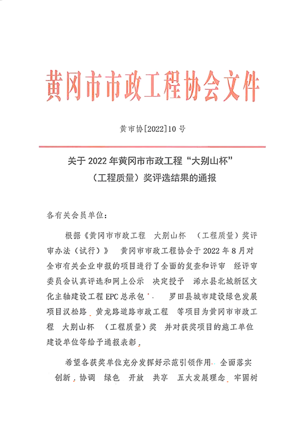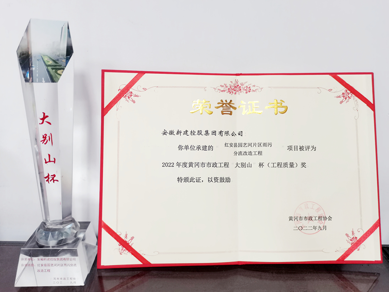 近日,黃岡市市政工程協(xié)會發(fā)布2022年度黃岡市市政工程(大別山杯)表彰名單,集團公司承建的紅安縣園藝河片區(qū)雨污分流改造工程被評為2022年度黃岡市市政工程大別山杯(工程質量獎)。