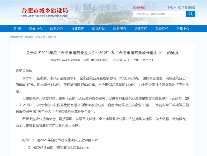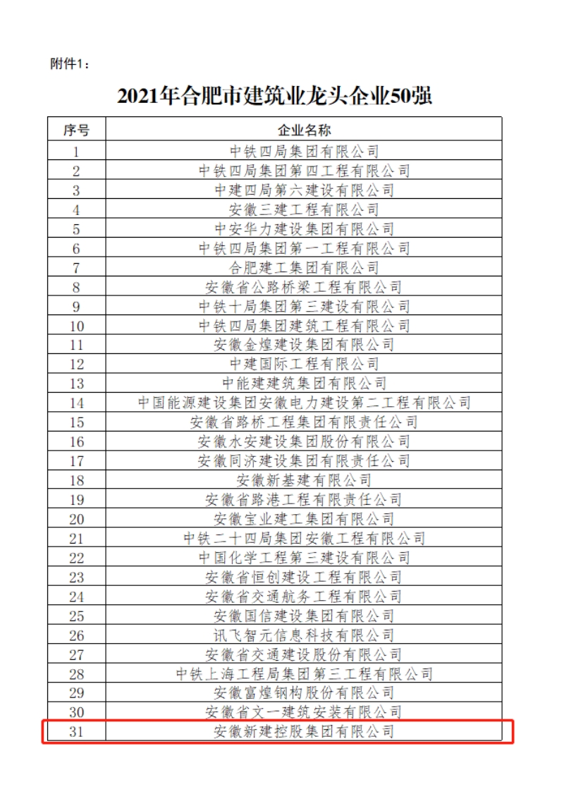 近日,合肥市城鄉(xiāng)建設(shè)局官網(wǎng)通報(bào)“2021年度合肥市建筑業(yè)龍頭企業(yè)50強(qiáng)”名單,并發(fā)文表彰“2021年合肥市建筑業(yè)外向發(fā)展優(yōu)秀企業(yè)”,安徽新建再次獲評(píng)2021年合肥市建筑業(yè)外向發(fā)展優(yōu)秀企業(yè),并榮登合肥市建筑業(yè)龍頭企業(yè)50強(qiáng)榜單。
