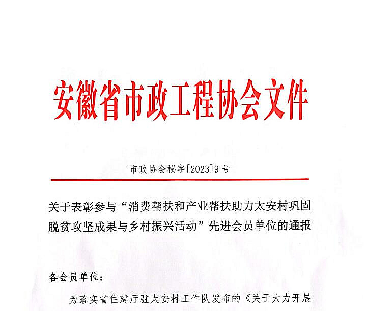 近日,安徽省市政工程協(xié)會(huì)發(fā)布關(guān)于表彰參與“消費(fèi)幫扶和產(chǎn)業(yè)幫扶助力太安村鞏固脫貧攻堅(jiān)成果與鄉(xiāng)村振興活動(dòng)”先進(jìn)會(huì)員單位的通報(bào)。表彰安徽新建控股集團(tuán)在內(nèi)的三百家企業(yè),積極參與了太安村鞏固脫貧攻堅(jiān)成果與鄉(xiāng)村振興活動(dòng),以實(shí)際行動(dòng)履行社會(huì)責(zé)任。