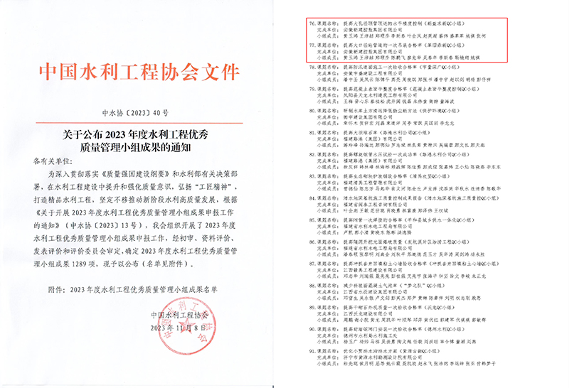 近日,中國(guó)水利工程協(xié)會(huì)在福州舉行2023年度水利工程優(yōu)秀質(zhì)量管理小組活動(dòng)成果發(fā)布會(huì),經(jīng)過激烈角逐,集團(tuán)公司新益求新QC小組《提高大孔徑頂管頂進(jìn)的水平精度控制》和革舊鼎新QC小組《提高大口徑碎管道的一次吊裝合格率》2項(xiàng)課題成果入圍,喜獲Ⅲ類成果獎(jiǎng)。