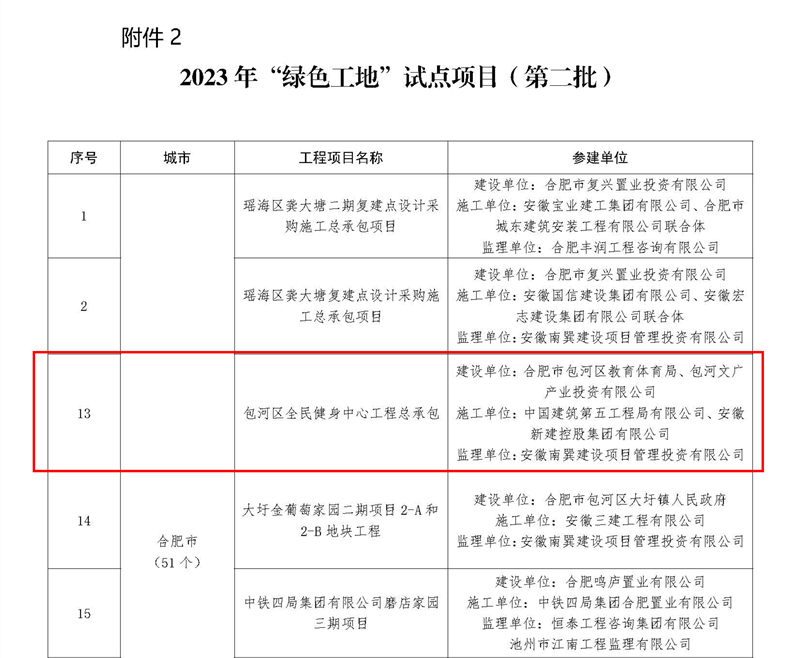 近日,安徽省住房和城鄉(xiāng)建設(shè)廳網(wǎng)站公布了2023年“四個工地”(第二批)試點項目的名單,集團公司承建項目濱湖新區(qū)貴杭小學(xué)、包河區(qū)全民健身中心工程總承包、包河BH202214地塊項目總包工程獲得“紅色工地”試點稱號,其中包河區(qū)全民健身中心工程總承包同時獲評“綠色工地”稱號。
