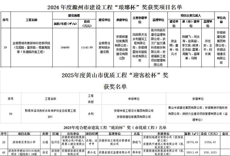 其中榮獲合肥市建筑工程“琥珀杯”獎(jiǎng)的項(xiàng)目是濱湖新區(qū)貴杭小學(xué)、濱湖科學(xué)城BK202101地塊項(xiàng)目2#樓;獲得黃山市優(yōu)質(zhì)工程“迎客松杯”獎(jiǎng)的項(xiàng)目是黟縣豐溪河良好水體保護(hù)與生態(tài)修復(fù)工程EPC;獲得滁州市建設(shè)工程“瑯琊杯”獎(jiǎng)的是全椒縣城市更新和補(bǔ)短板項(xiàng)目((花園路、富安路、襟襄南路等7條道路改造工程)。此外,安徽甲天科技有限公司技術(shù)研發(fā)中心項(xiàng)目工程被評為合肥市建筑工程優(yōu)質(zhì)結(jié)構(gòu)項(xiàng)目;包河區(qū)吉林路(黃河路-錦繡大道)道路工程被評為合肥市市政工程安全生產(chǎn)標(biāo)準(zhǔn)化工地。