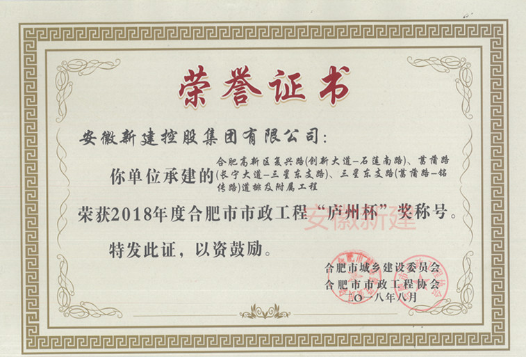 近日,合肥市市政工程協(xié)會舉辦了2018年度聯(lián)通會暨相關(guān)業(yè)務(wù)培訓(xùn),會議表彰了2018年度合肥市市政工程“廬州杯”獎,并現(xiàn)場頒發(fā)了獎項。由我公司承建的合肥高新區(qū)復(fù)興路(創(chuàng)新大道-石蓮南路)、菖蒲路(長寧大道-三星東支路)、三星東支路(當蒲路-銘傳路)道排及附屬工程與廬江縣經(jīng)濟開發(fā)區(qū)建設(shè)投資有限公司磙橋路工程施工獲此殊榮。