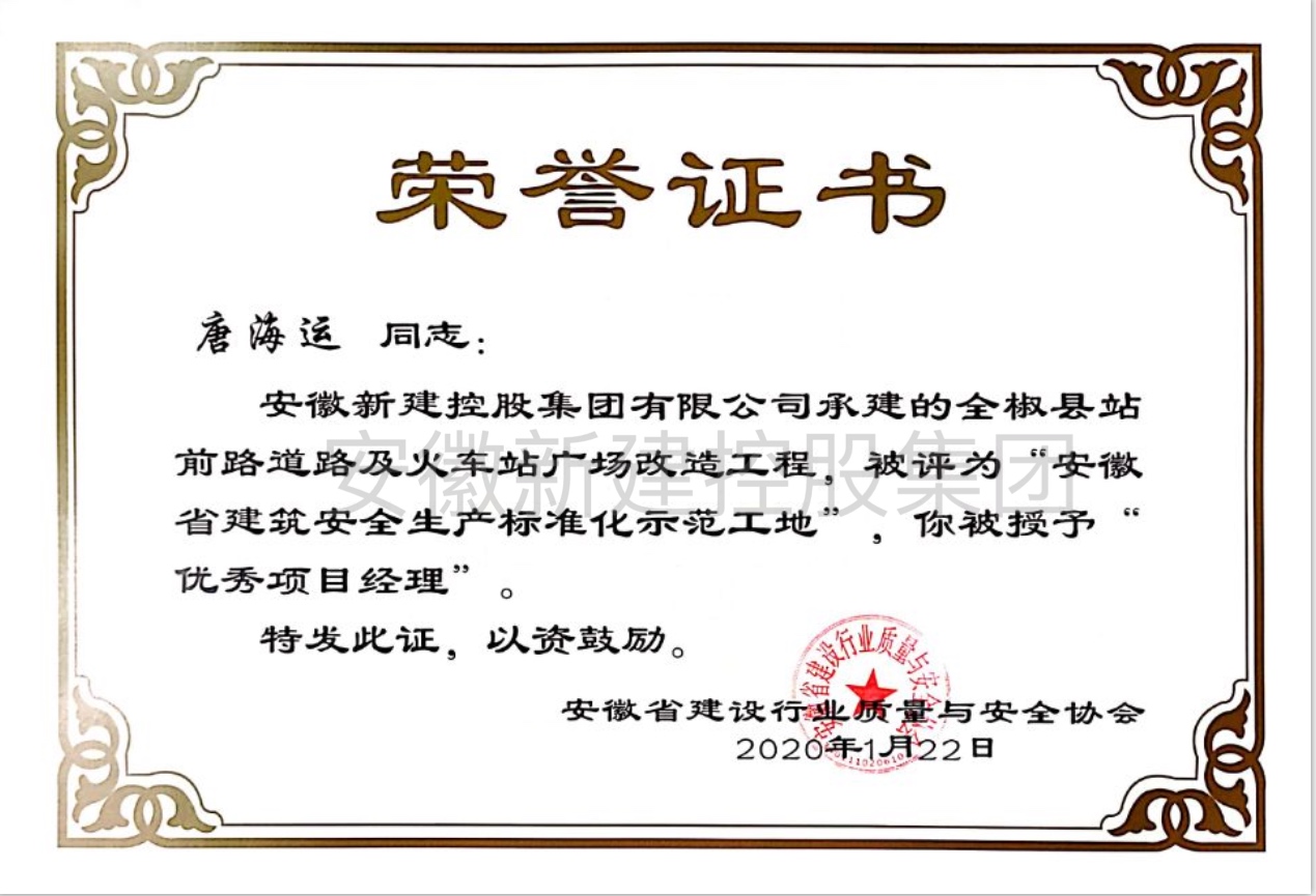 近日,我公司承建的全椒縣站前路道路及火車站廣場(chǎng)改造工程,通過(guò)安徽省建設(shè)行業(yè)質(zhì)量與安全協(xié)會(huì)的嚴(yán)格考評(píng),被評(píng)為“安徽省建筑安全生產(chǎn)標(biāo)準(zhǔn)化示范工地”稱號(hào)。唐海運(yùn)獲“優(yōu)秀項(xiàng)目經(jīng)理”稱號(hào)。