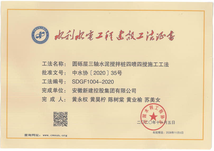 近日,根據(jù)《水利水電工程建設工法管理辦法》(中水協(xié)[2016]6號)和《關于開展2020年度水利行業(yè)工法申報工作的通知》(中水協(xié)[2016]7號)精神,經中國水利工程協(xié)會組織專家進行綜合評審,我公司申報的“圓礫層三軸水泥攪拌樁四噴四攪施工工法”順利通過2020年度水利行業(yè)工法評審,獲得水利水電工程建設工法證書!