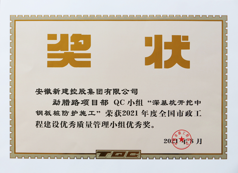 近日,中國(guó)市政工程協(xié)會(huì)頒發(fā)了2021年度全國(guó)市政工程建設(shè)優(yōu)秀質(zhì)量管理小組獲獎(jiǎng)證書,安徽新建控股集團(tuán)2項(xiàng)QC小組成果“深基坑開挖中鋼板樁防護(hù)施工”、“提高鉆孔灌注樁成樁質(zhì)量一次合格率”榮獲優(yōu)秀獎(jiǎng),工程質(zhì)量管理繼續(xù)向前邁步。
