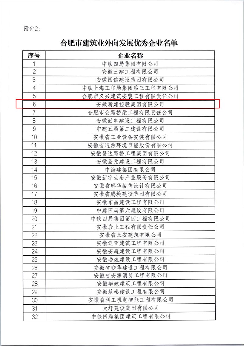 近日,合肥市城鄉(xiāng)建設(shè)局官網(wǎng)通報(bào)“2021年度合肥市建筑業(yè)龍頭企業(yè)50強(qiáng)”名單,并發(fā)文表彰“2021年合肥市建筑業(yè)外向發(fā)展優(yōu)秀企業(yè)”,安徽新建再次獲評(píng)2021年合肥市建筑業(yè)外向發(fā)展優(yōu)秀企業(yè),并榮登合肥市建筑業(yè)龍頭企業(yè)50強(qiáng)榜單。