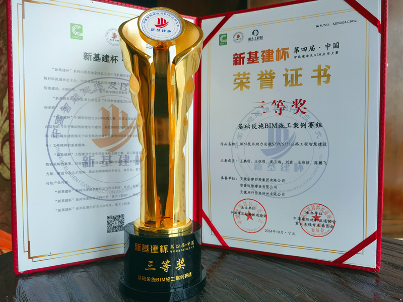 10月21日,由中國建筑材料流通協(xié)會主辦的第三屆中國重大工程數(shù)字生態(tài)大會暨第四屆“新基建杯”BIM應用大賽優(yōu)秀成果交流會在寧波召開,集團公司申報的《BIM技術助力安徽S239/S331公路工程智慧建設》榮獲大賽基礎設施BIM施工案例組三等獎。