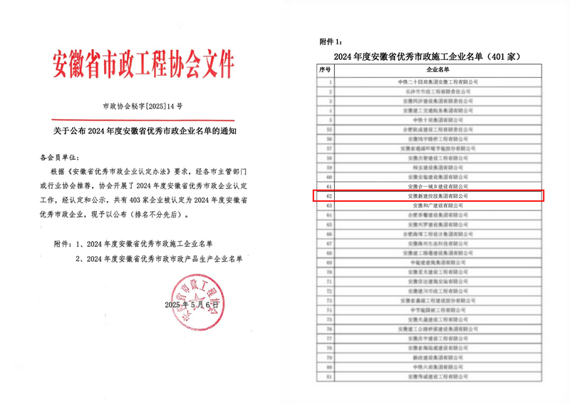 近日,安徽省市政工程協(xié)會(huì)發(fā)布通知,根據(jù)《安徽省優(yōu)秀市政施工企業(yè)認(rèn)定辦法》和《安徽省市政施工企業(yè)優(yōu)秀建造師(項(xiàng)目經(jīng)理)認(rèn)定辦法》要求,經(jīng)各市主管部門(mén)或行業(yè)協(xié)會(huì)推薦,經(jīng)認(rèn)定和公示,安徽新建控股集團(tuán)有限公司榮獲“2024年度安徽省優(yōu)秀市政施工企業(yè)”榮譽(yù)稱(chēng)號(hào)。